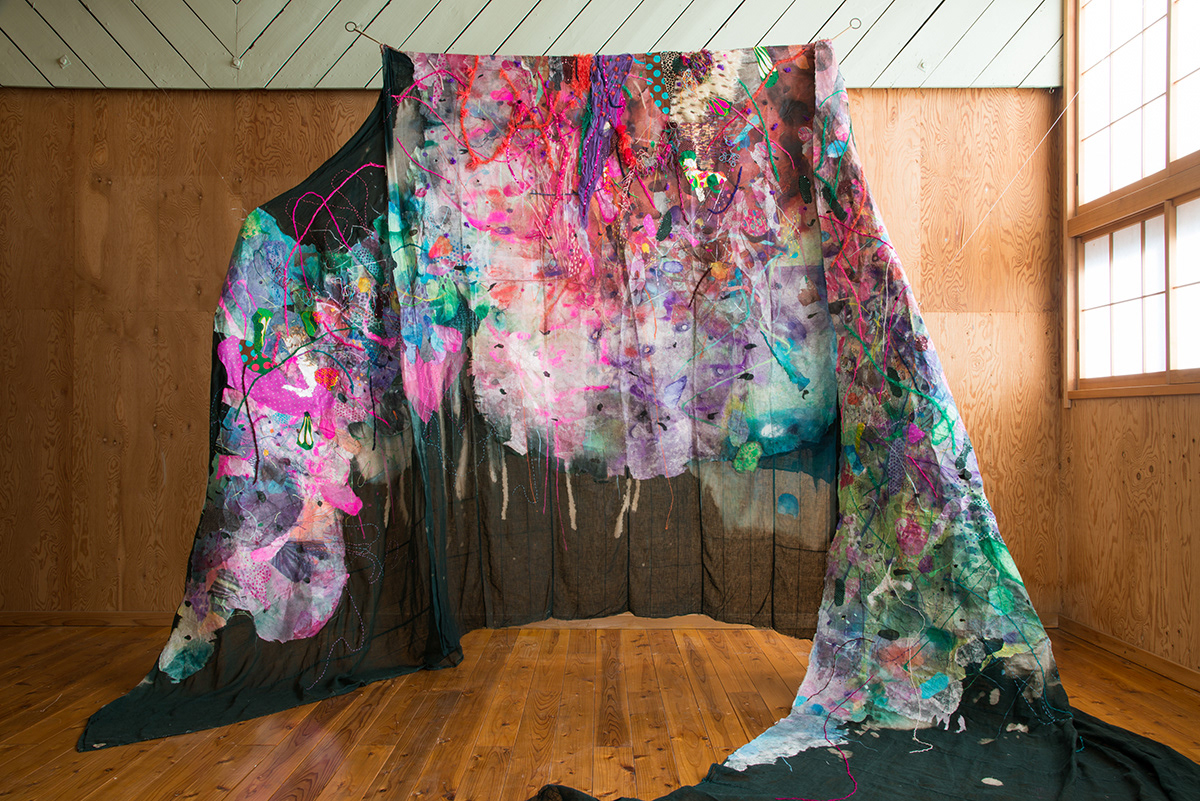 250x359x300cm 蚊帳、楮紙、顔料、墨、箔 etc Mosquitonet、Kozopaper、color 、 sumi 、 foil etc